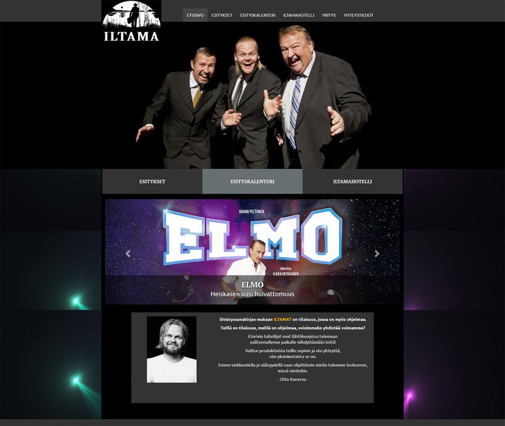Iltama - Onnellinen Mies Oy12.06.2018Iltama on Onnellinen Mies Oy:n sivusto, jossa myydään ja kerrotaan sekä yrityksen omista näytelmistä että heidän kauttaan välitettävistä esityksistä. Iltaman sivuilla voi tutustua erilaisiin komedioihin ja parodioihin joita voi tilata omiin tapahtumiinsa. Sivuilta löytyy myös keikkakalenteri yleisiin näytöksiin. Näytöskalenteria päivitetään kätevästi viemällä päivitetty Excel-lista verkkosivujen mediapankin kansioon. Tämä automaattisesti poistaa vanhan kalenterin ja asettaa tilalle uuden. Näytelmät on perustettu kätevällä uutispalsta-toiminnolla. Sen ansiosta pikkukuvat ovat aina samankokoisia. Artikkelin sisään voidaan lisätä lisäkuvia rajattomasti. Tagit: Opiportal Verkkosivusto Takaisin