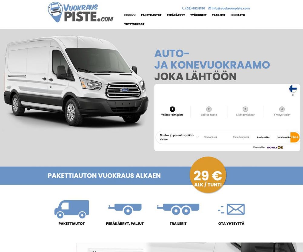 Etusivulla lähdettiin pohtimaan, miten heti alussa saadaan asiakas kiinnittämään huomion erittäin kilpailukykyiseen hintaan ja ulkoisesti tässä onnistuttiin tehokkain keinoin. Etusivulla vuokraus on helppoa ja matalalla kynnyksellä, sillä heti alkuun on upotettu ulkoinen vuokra-auton haku- ja varaustoiminto. Tämän jälkeen asiakasta ohjataan lukemaan lisää erilaisista vuokra-ajoneuvoista joita hän on tullut etsimään.